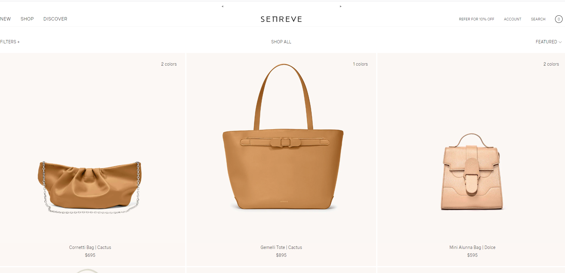 「SENREVE」是一家由华裔女性创立的奢侈品包袋品牌。SENREVE定位全球化DTC品牌,于2016年在美国成立,2019年打入国内市场,也在欧洲、北美、澳洲和东南亚的多个国家销售。SENREVE面向新世代多元化女性设计风格简约大气、兼顾设计感与功能的轻奢包袋,切入500-1500美元价格区间。