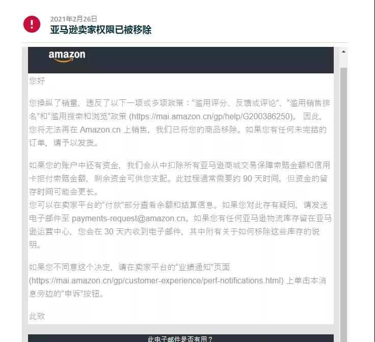 实际上,从年初开始,不少亚马逊卖家都收到了来自亚马逊官方邮件的提示预警:您的账户有被停用的风险,我们与你联系是因为您似乎违反了Amazon.com的以下一项或多项卖家行为准则要求……