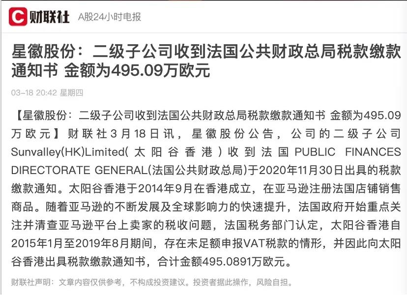 实际上,在被封杀之前,今年3月,法国政府开始严查亚马逊卖家的纳税问题,泽宝棣属的星徽股份的二级子公司,就曾收到法国公共财政总局税款缴款通知书 金额495.09万欧元,折合人民币约3800万元。