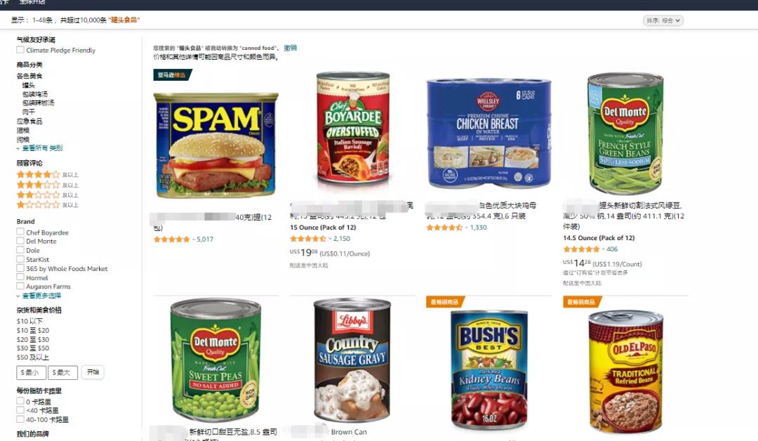 在亚马逊平台上搜索“罐头食物”,显示的相关搜索链接竟然超过10000+,而且种类繁多,足以证明海外消费对于罐头食物有多偏爱!