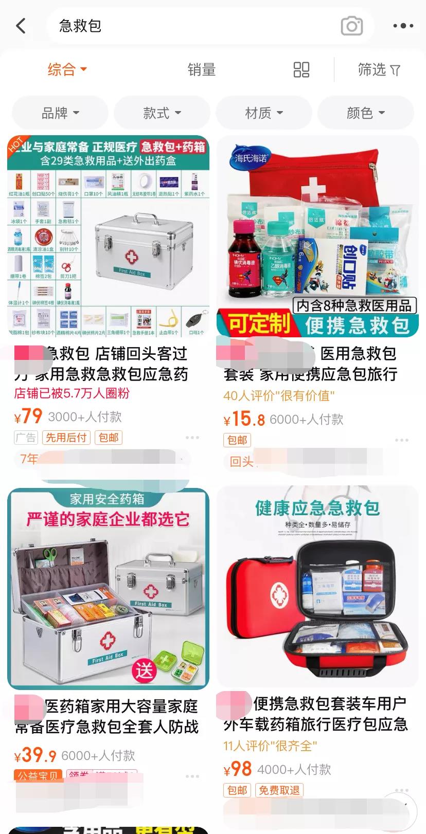 “恰逢国内双十一大促,不少卖急救包的直播间十分火爆。”一位国内卖家如是说道。在国内某电商平台搜索急救包或医药箱,各种品牌琳琅满目,且销量均不差,甚至有些店铺回头客就有2万+,价位普遍在20-100元左右。