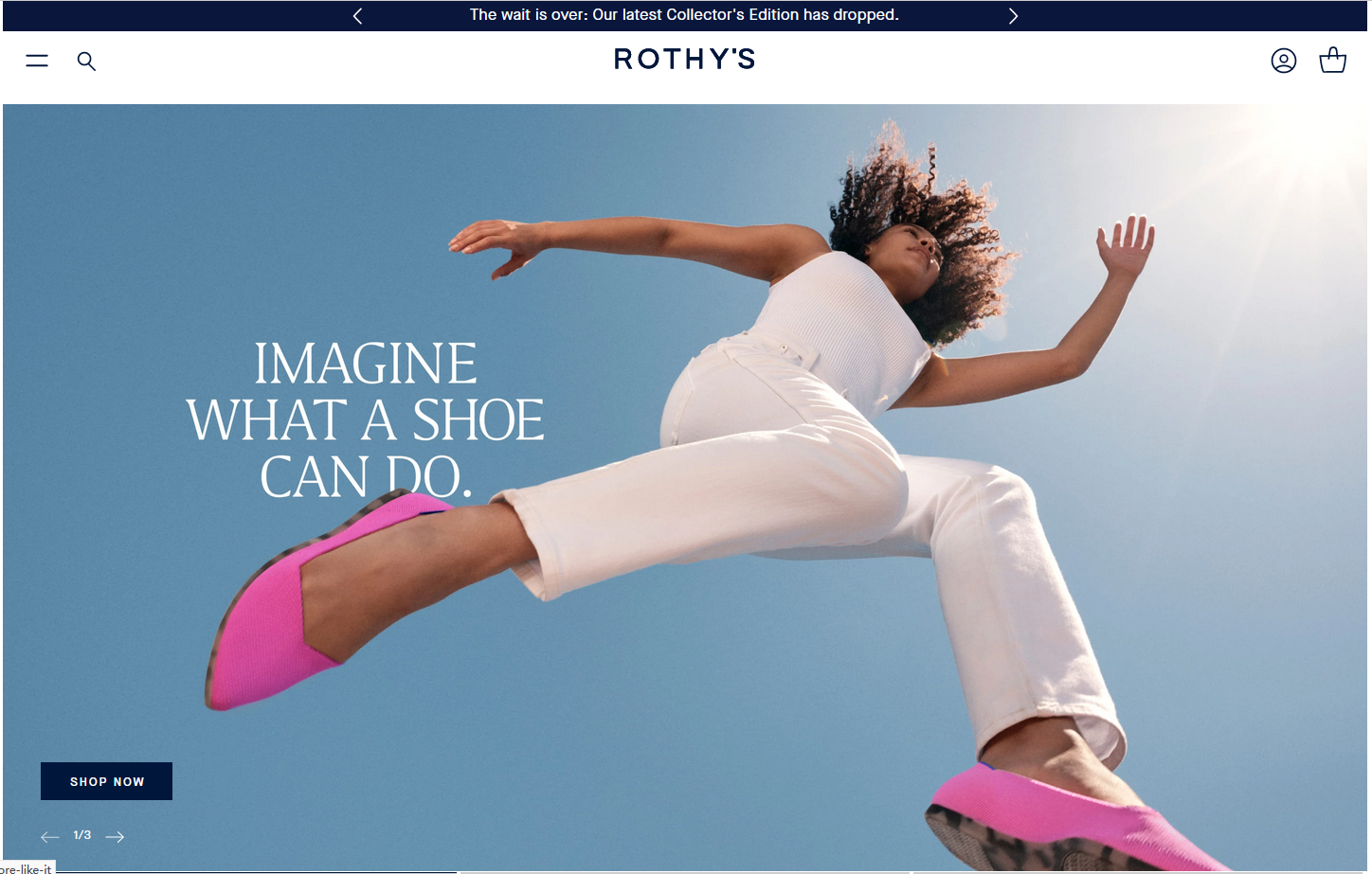 Rothy’s,这是一家直接面向消费者(DTC)的鞋业品牌,以其时尚舒适的平底鞋而闻名。Rothy Martins由企业家Roth Martin和Stephen Hawthornthwaite于2016年推出,旨在满足消费者对舒适、时尚、可持续产品的需求。
