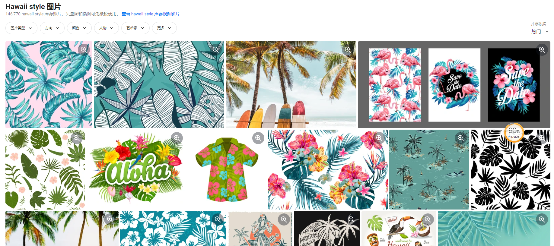 还有一个设计的来源,就是直接购买现成的设计。还拿夏威夷风格的设计举例,我们可以直接到素材网站去搜索,看看有没有满足我们需求的设计。