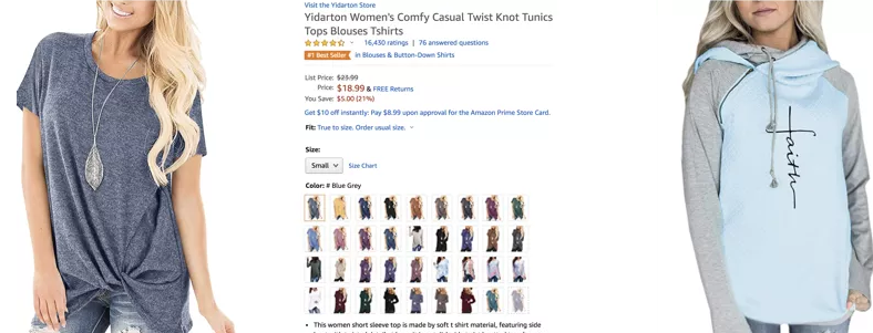 左边这件衣服是亚马逊某个分类下的BestSeller,样式很受欢迎,可以去POD平台找找有没有同款或者类似款式,如果没有的话,我们就可以自己联系POD工厂开发这款产品,然后可以针对不同的人群测试大量的图案。