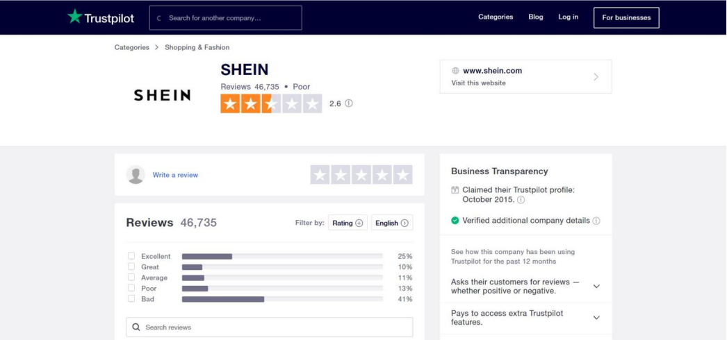 专业DTC独立站评分网站Trustpilot上,46735人给SHEIN打分,总评分仅2.6分(满分5分),评价等级是“Poor”。