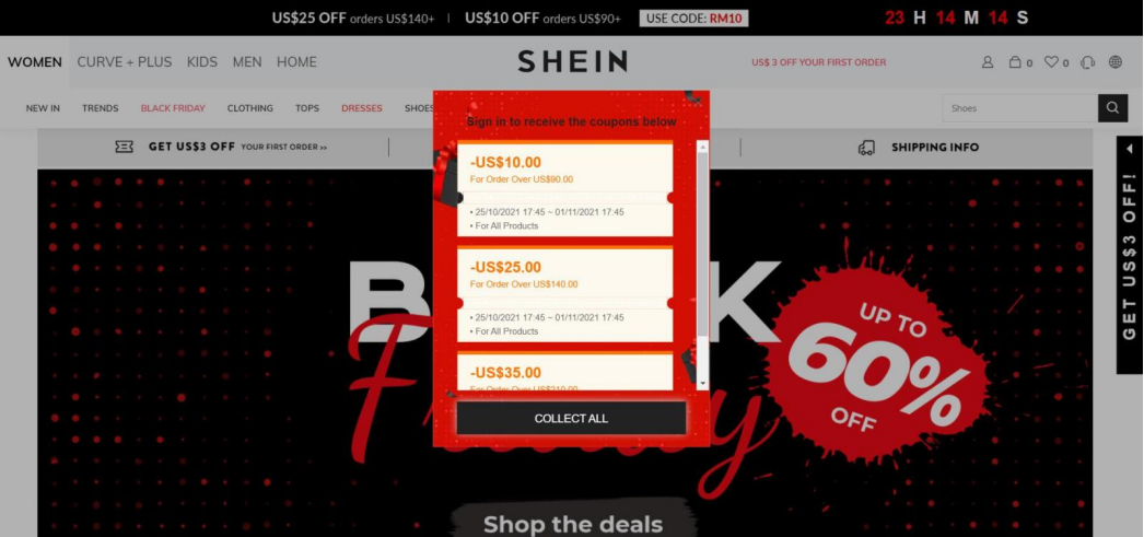 即便如此,SHEIN还经常打出“骨折价”,一个活动,首页显示4折,而在购买页面的引流款,甚至低至3折。
